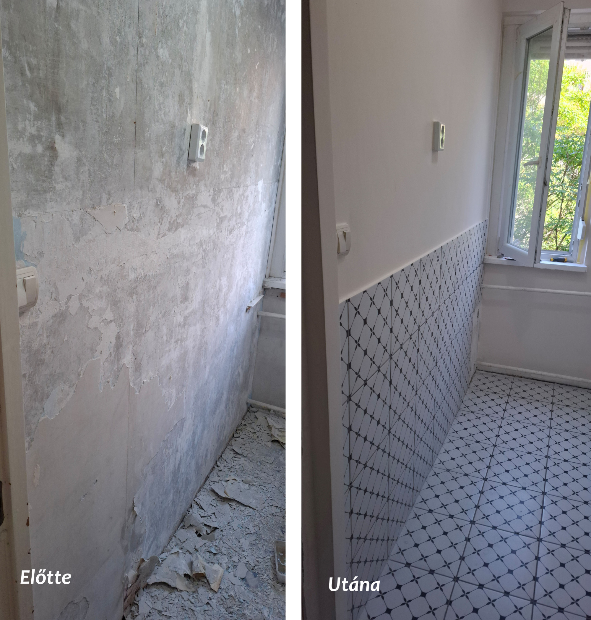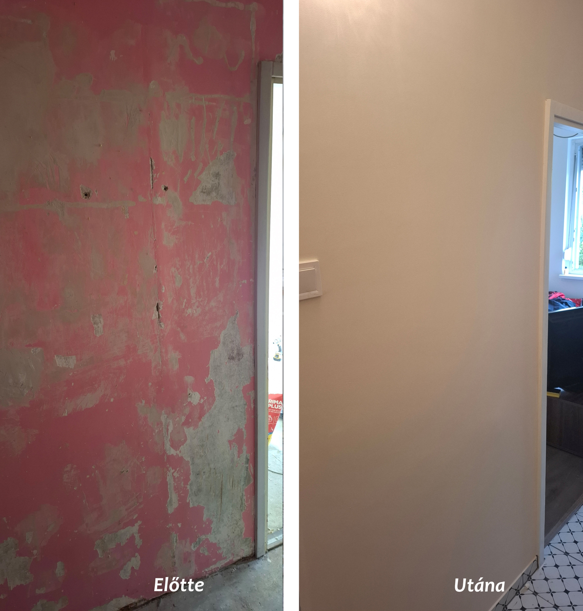 Konyha fal lekaparása, alapozás, glettelés, csiszolás, festés, majd burkolás